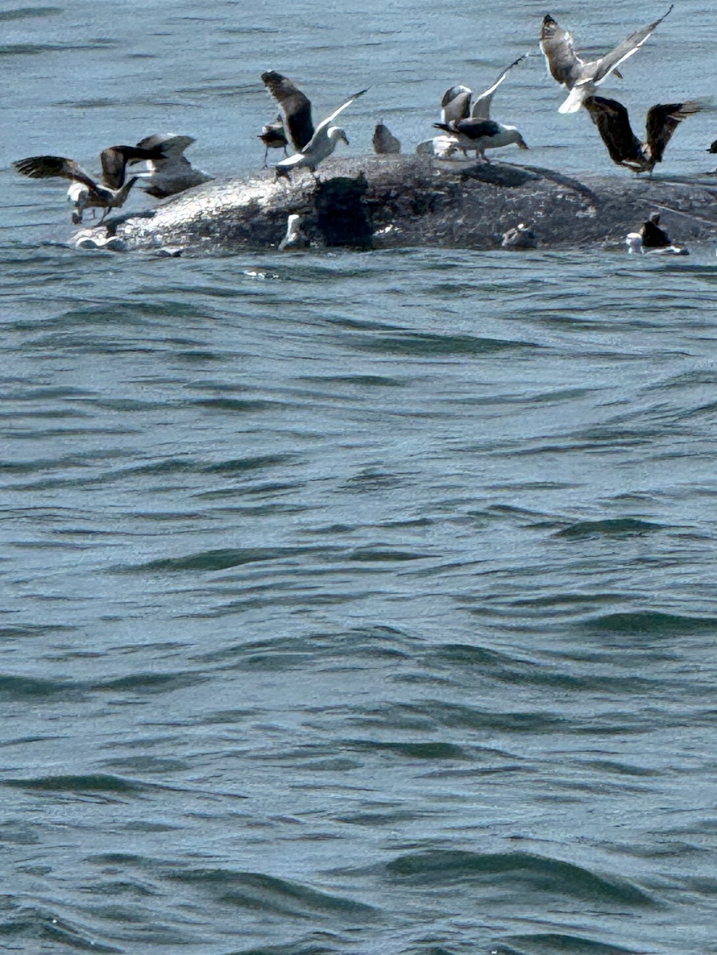 A whale. Dead. Humped on the water, still and enormous, the birds working at it in that patient, impersonal way that nature has always worked… We had seen one alive less than an hour before. Now we were looking at one returned. The same water. The same afternoon light. Birth and death sharing the same bay on the same Sunday, not asking our permission, not waiting for us to be ready.
